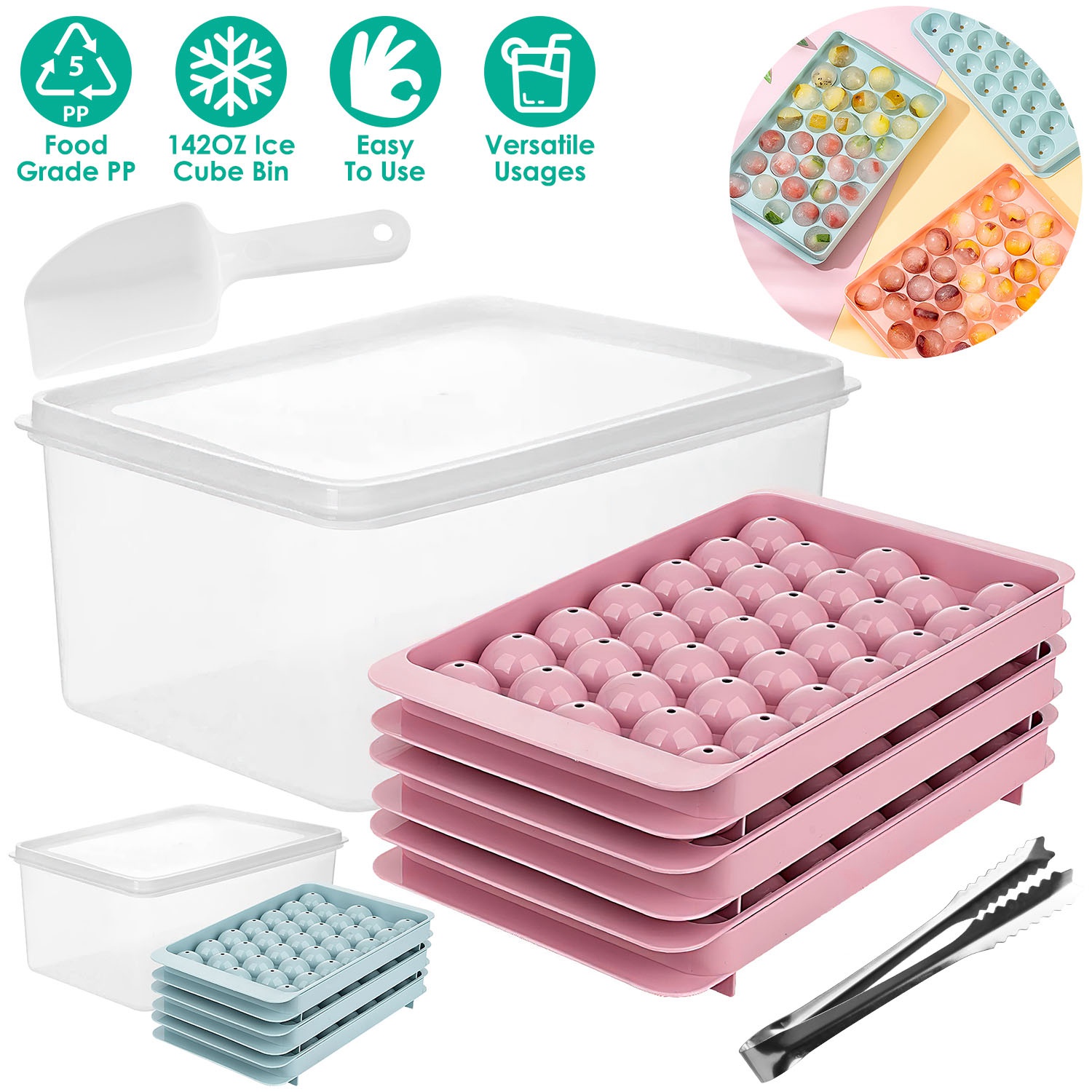 Do you like icy beverage and want to enjoy ice drinks anytime anywhere? Our 4 packs ice cube trays make ice small and fun, which is an easy and effective tool to get the ice balls in a short time than other standard ice trays. Food grade PP material makes it safe, non-toxic and durable for a long time use. With 4 trays and an ice cube container, you can make 132Pcs ice balls at one time and store about 400pcs ice balls in the ice bin to DIY your desired drink anytime with included ice scoop and ice tong.