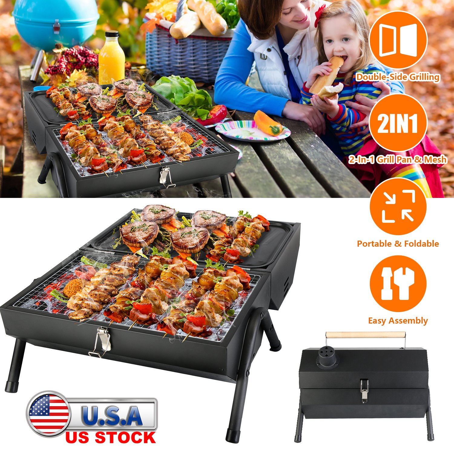 Do you want to enjoy BBQ anywhere with your whole family freely? Our portable Charcoal Grill is a perfect choice! It can be expanded for double-side cooking usage, suiting all your family barbecue needs. You can also fold it up in a compact size and lock the buckle for space-saving storage, and carry it with the top wood handle for easy transportation. Come with 1 grill pan to cook the beef, bacon, pork and other food, and comes with 2 grill mesh for whole chicken roasting, for burgers, fish, and veggies, kabobs, steak ribs and sausages. Ensures delicious results every time. Perfect for camping, fishing, hitting the beach, hosting cookouts, or simply grilling in the backyard.