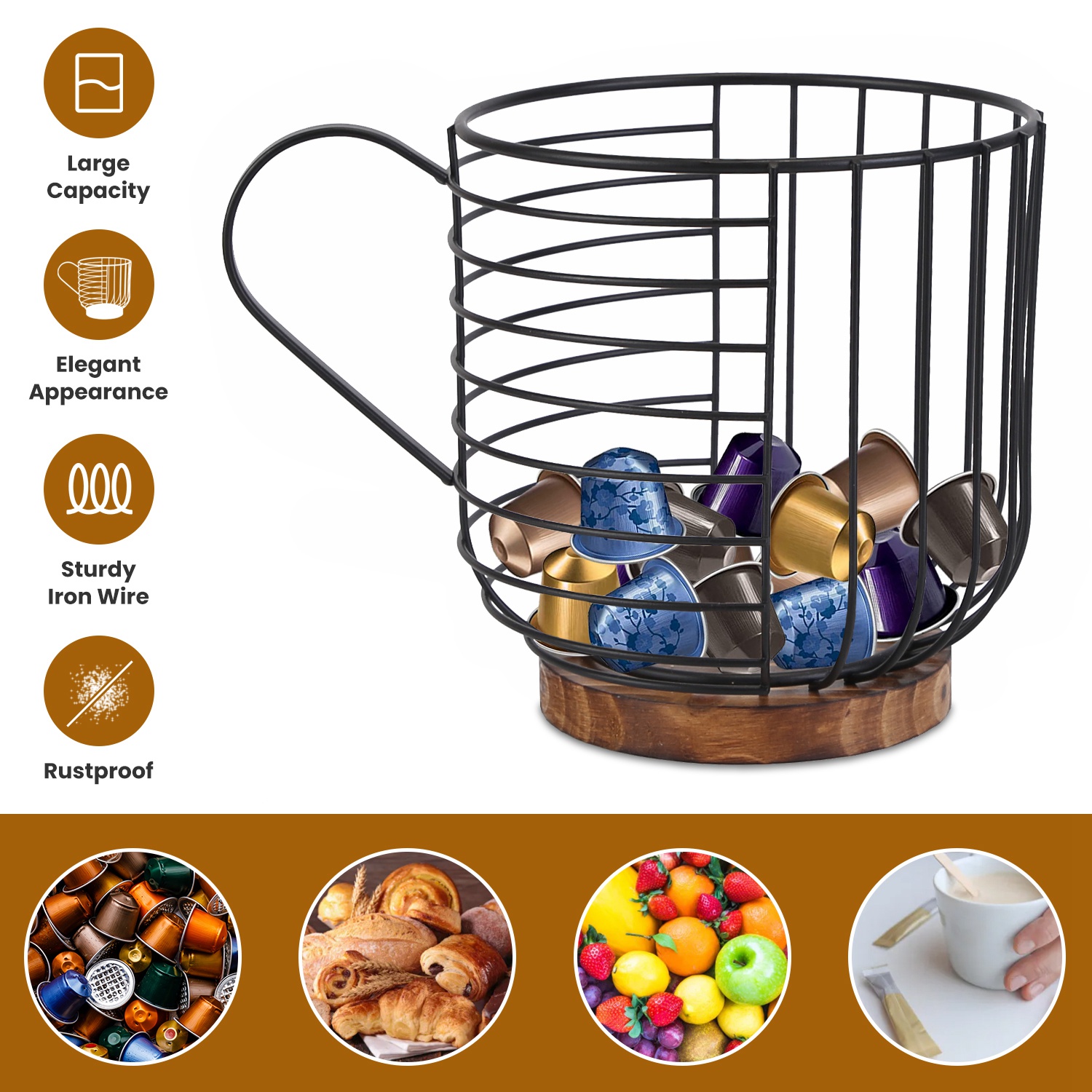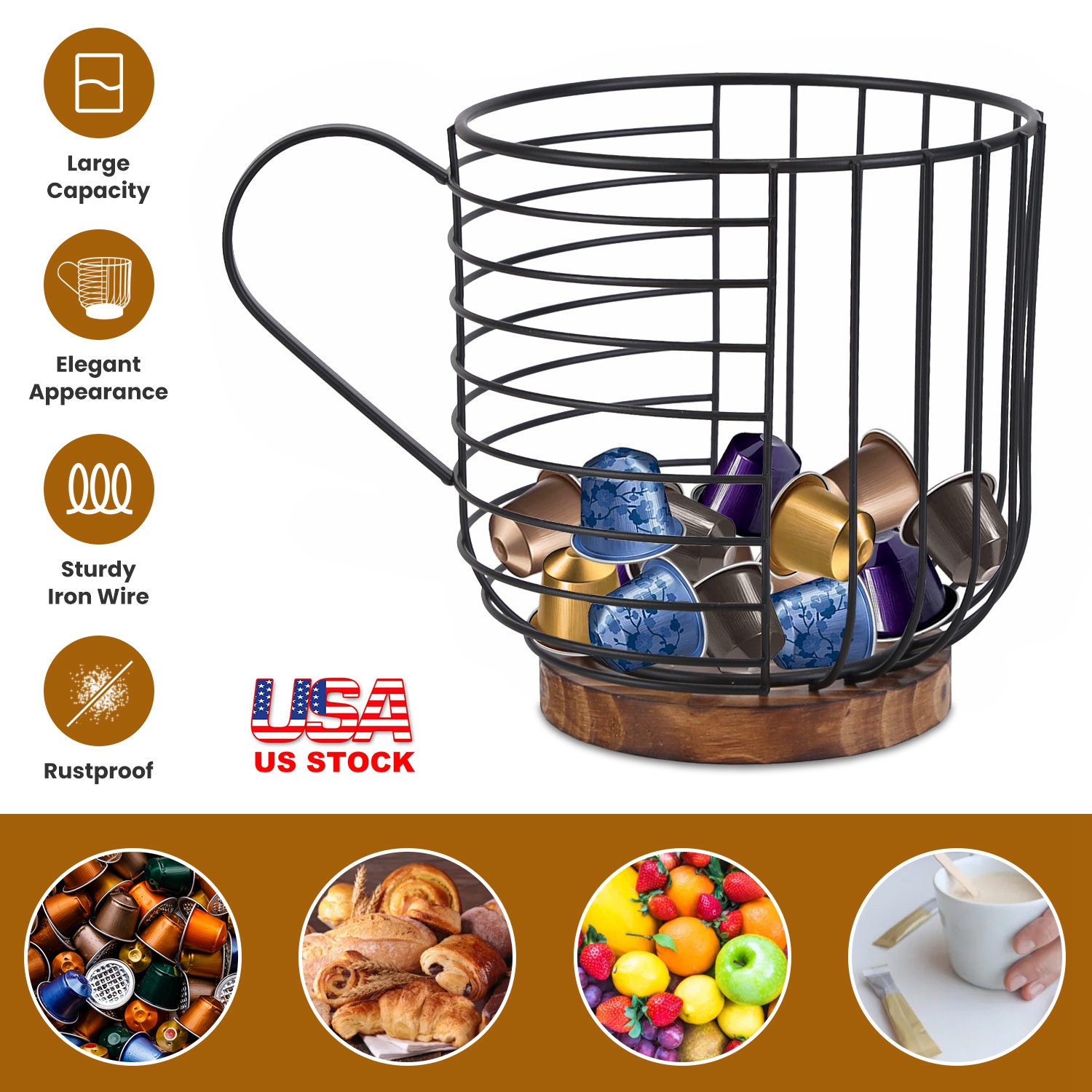 Measuring 5.91x8.26x6.1in, this coffee pod holder can accommodate a large amount of coffee capsules, fruit, bread, snack and so on. Made of natural solid wooden base and stoving varnished iron wire, this Kcup organizer ensures strength, not easy to get rust, corrosion, and long-lasting color retention while adding an elegant touch to your coffee-themed settings and decorations. This practical and affordable assistant is perfect for maintaining a tidy coffee corner.