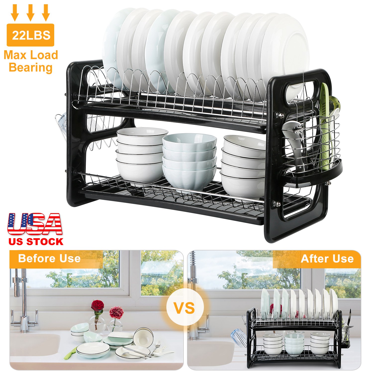 2 Tier Iron Dish Drying Rack Drainboard Set with Large Storage Anti-Rust Dish Drainer Shelf Tableware Holder Cup Holder For Kitchen Counter Storage