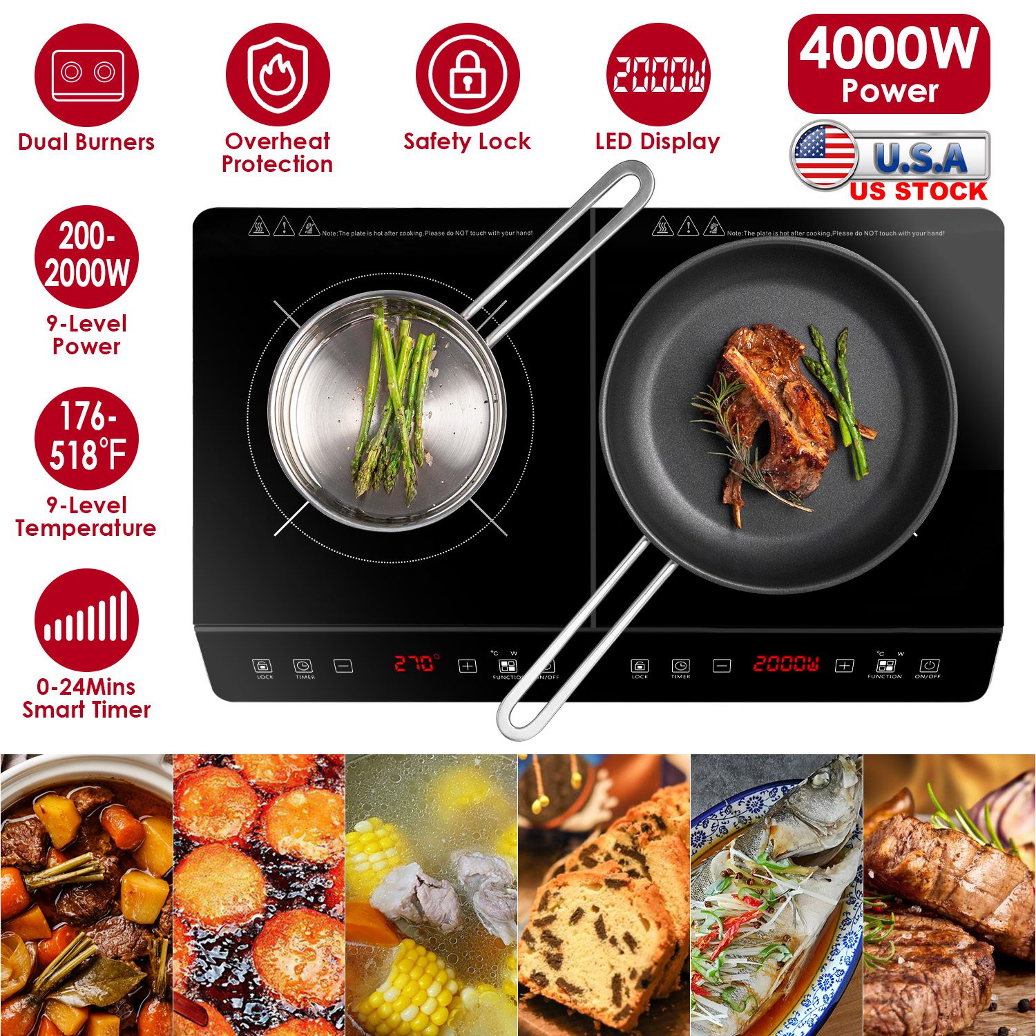 Our Induction Cooker featuring with two independent 2000W burners controlled by separate touch buttons, allows you to cook two kinds of food simultaneously or just use one stove individually according to your demands. It offers 9 levels of firepower (200W to 2000W) and 9 temperature settings (176℉ to 518℉), perfect for simmering, frying, boiling, baking, steaming, and slow cooking a variety of delicious meals. With its smart timer setting (0-3H), you can enjoy cooking without constantly monitoring. Designed with a safety lock for safer cooking and smooth surface for easy cleaning. Compatible with various cookware and serves as a reliable kitchen assistant. Upgrade your kitchen experience with our electric induction cooktop today!