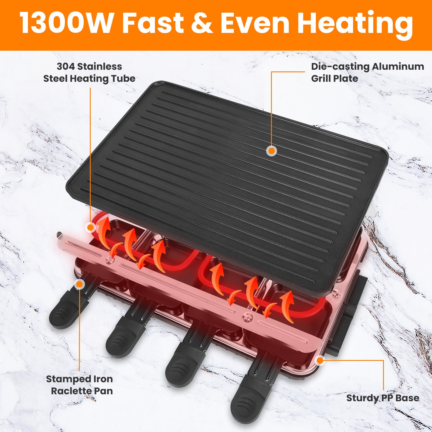 1300W Raclette Desktop Grill for 8People Non-Stick Reversible Electric Indoor Griddle with 8 Cheese Melt Pans Adjustable Temperature Dishwasher Safe K