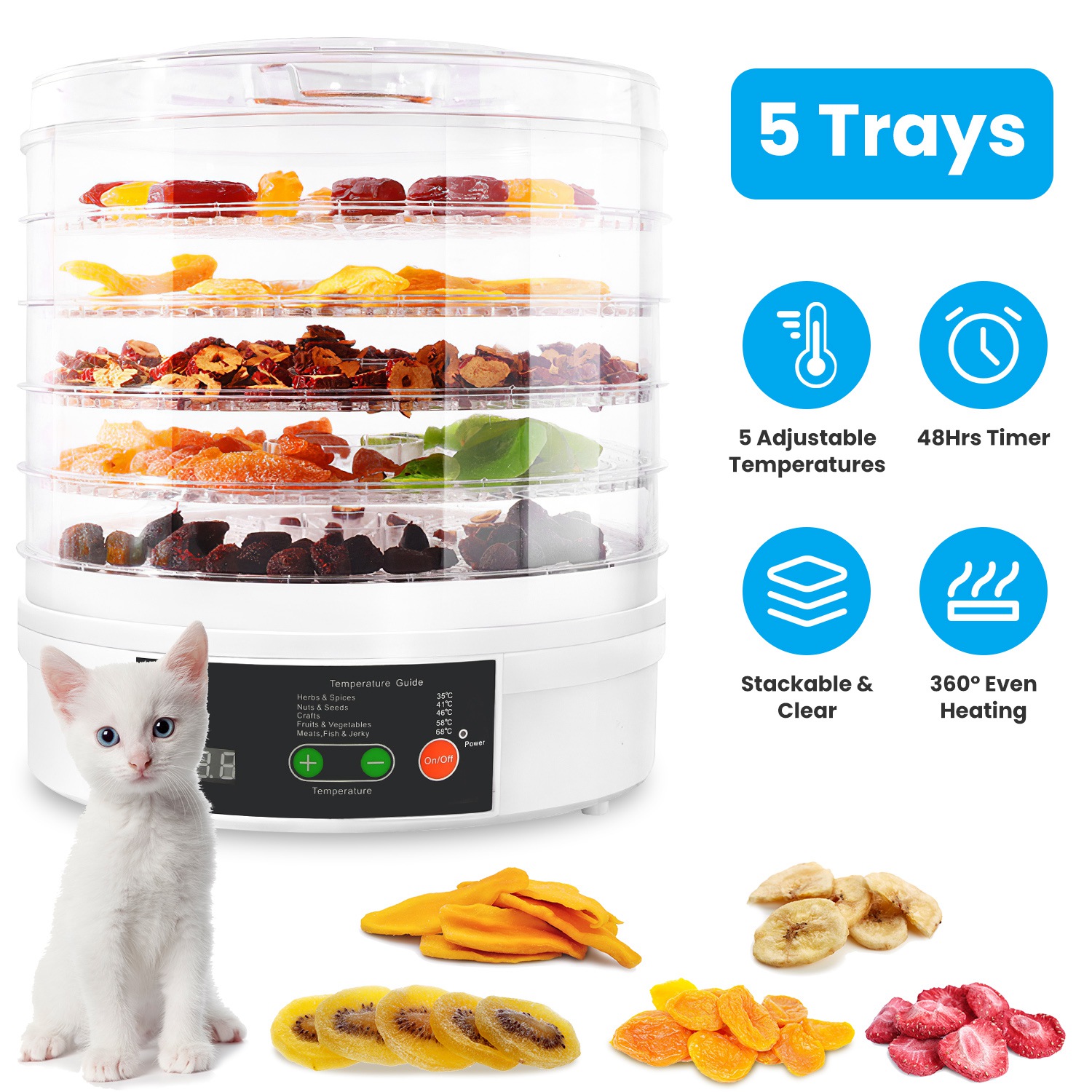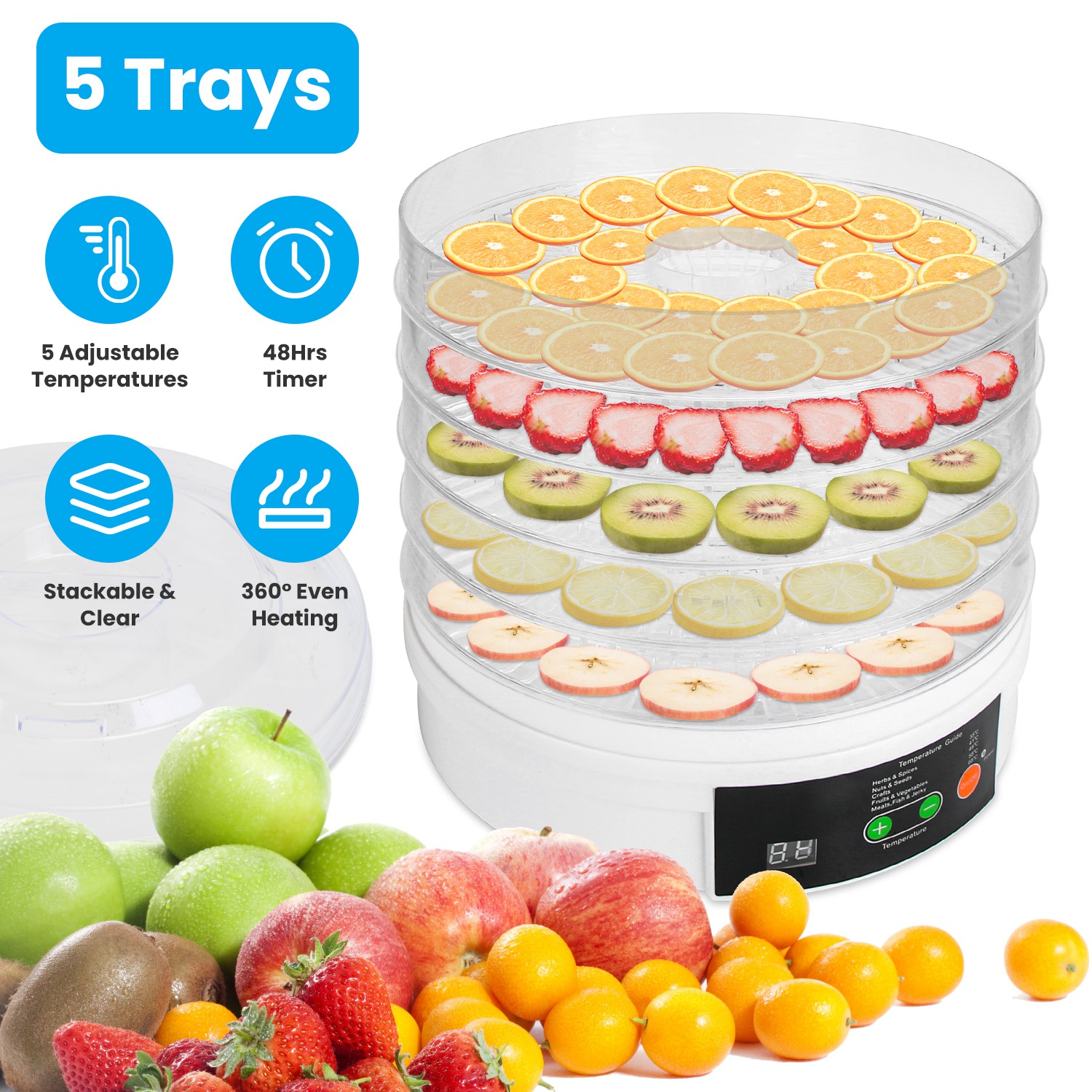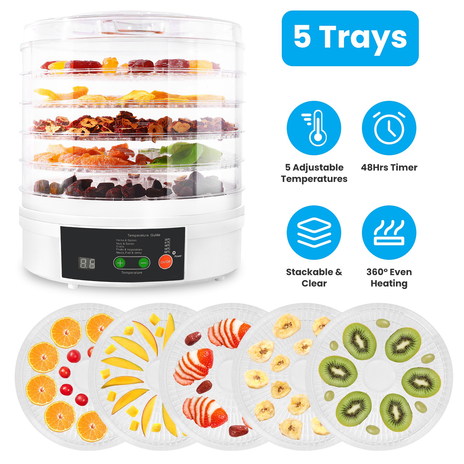 Featuring 5 temperature settings and timer up to 48 hours, this food dehydrator enables you to dry a variety of foods, such as fruits, vegetables, bread chips, herbs, seeds, nuts, meats etc.. 5 stackable clear trays for saving space and process monitoring. 345W pure copper motor for 360° hot airflow and even heating for each layer. Widely used for daily tea bags, healthier snacks, breakfast and picnic preparation, pet treats, cooking spices and so on. Eat healthier with our food drying machine!