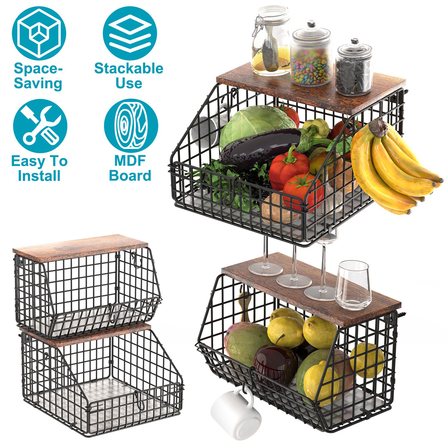 Built to solve your messy countertop in small kitchen! Comes with 2pcs wire fruit baskets of different sizes, offering a neat and organized way to store various fruits and vegetables. Made of metal wires with powder coating and solid wooden board, ensuring durability while stylish appearance perfectly match various kitchen styles. Can be used as a standard unit on desktop or hang on wall, and offer you option to stack them together. Suitable for placing fruits, onions, potatoes, bread, snacks, and produce.