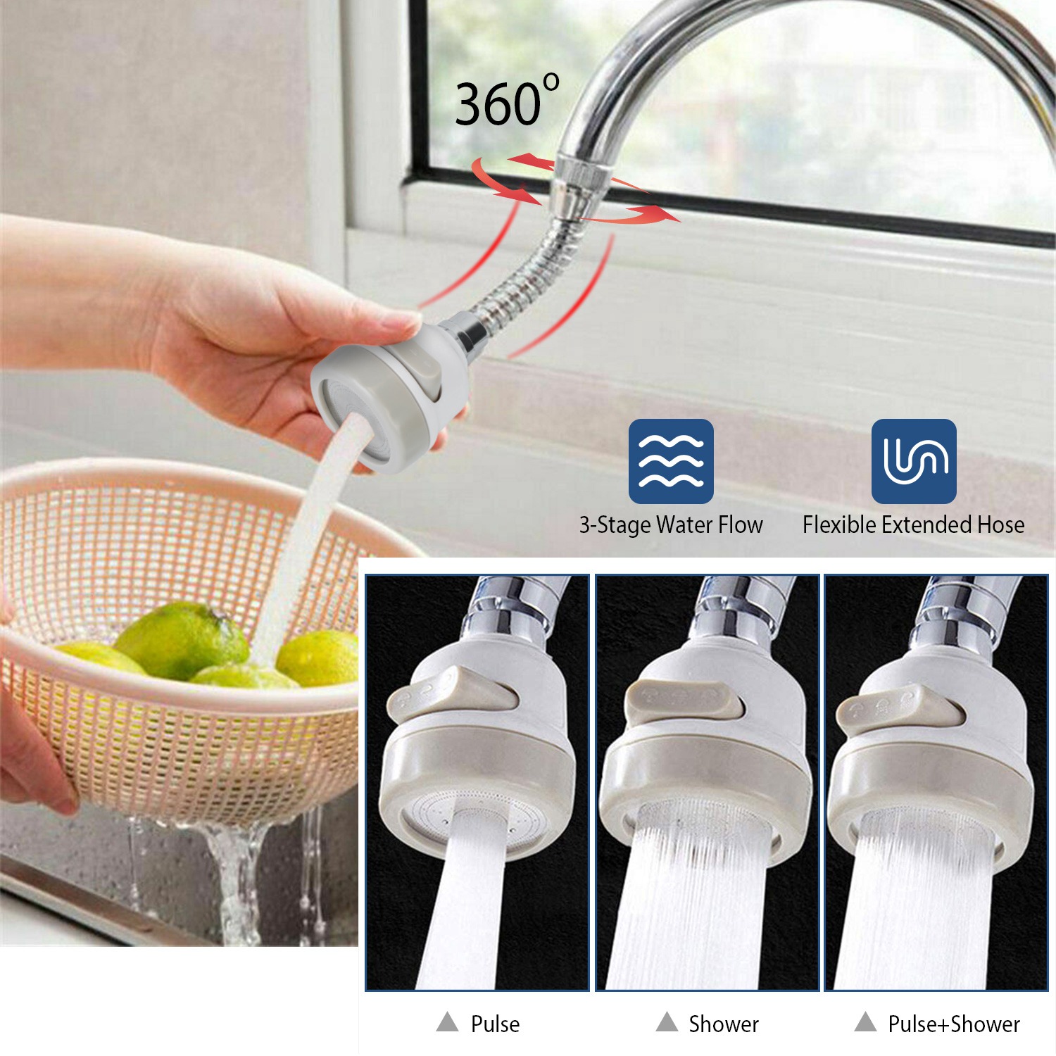 Our tap head faucet can be adjusted three water outlet modes to meet different needs and save water. Its flexible extended hose and rotatable head design provide more convenience for kitchen washing and cleaning.