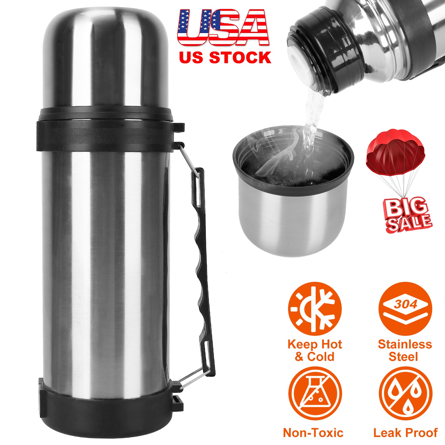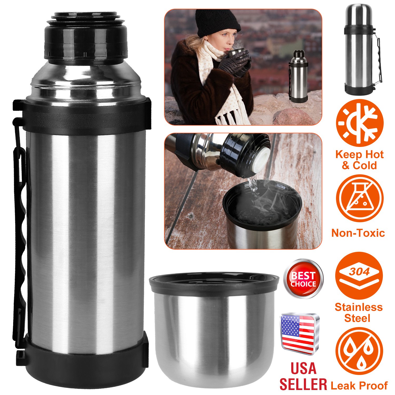 Made of Food Grade & Non-Toxic stainless steel, safe to use and drink from, our bottle provides a robust build for outdoor using with 40.57 ounce capacity. It can support both ice and hot drink about 12 hours. The large lid can be used as a drinking cup on the go! And the bottle mouth of 2in diameter is big enough to add ice cubes or fruit to your water and drinks. Silicone ring and well-made thread allow it to be leak-proof no matter tipped over or shake it.
