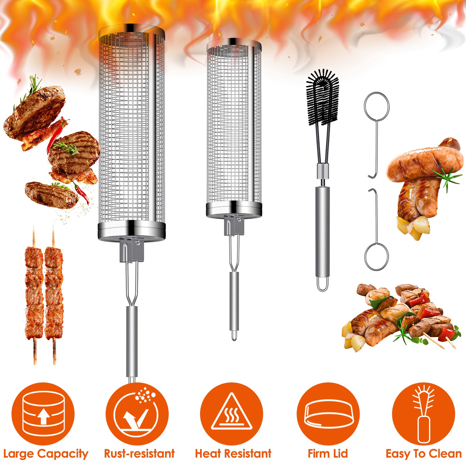Looking for portable grilling accessories for outdoor grill? Try these BBQ net tubes! Made of rust-resistant 304 stainless steel, our rolling grill baskets can not only can withstand the heat of the grill, but also rotate 360 degrees to ensure that food is evenly heated. Features firm lids to secure food, portable handles to rolling the basket and convenient hooks to securely lock or unlock the baskets. Dishwasher safe and easy to clean with the included cleaning brush. Perfect charcoal grill accessories to cook food, such as asparagus, string beans, spinach, kale, brussel sprouts, french fries, meatballs, salmon and even fruits. Comes with 2 different size. Grill more food in less space at the same time!