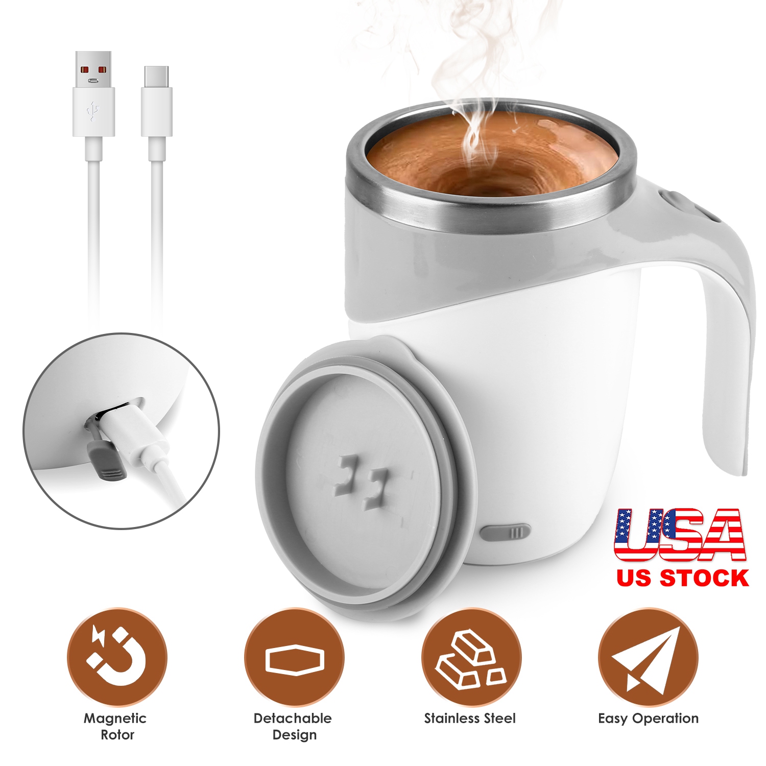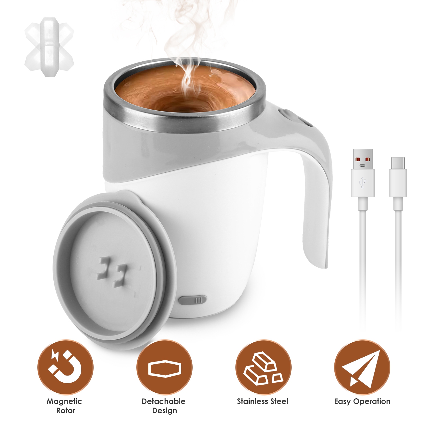 Our electric magnetic auto stirring coffee mug is the perfect solution for effortless and thorough mixing of your favorite beverages. Crafted from 304 stainless steel, this self-mixing coffee cup is rust, high-temperature, and corrosion-resistant, ensuring both safety and durability. The detachable magnetic stir rotor allows for easy and effective cleaning, while smooth interior surface prevents residue buildup. Enjoy your mixed beverages with just one press of button. A thoughtful and practical gift for any beverage lover in your life.