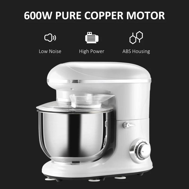 This Silver Stainless Steel Tilt 600W Electric Mixer 6QT is designed with a high-performance 600W pure copper motor and multiple speed choice to more effectively knead dough and beat eggs, this food mixer provides versatility for frosting, creamy dressings, dough, and baked goods. This standing mixer has a 6-level speed ranging from low to high, providing options to knead gently and thoroughly mix,. Press the 'P' button to mix at the fastest speed in a short time. This stand mixer's 6qt mixing bowl lets you make two dozen cookies or four loaves of bread in a single batch. It also includes a dough hook, beater, and whisk to expand your culinary options. The tilt-head design allows less mess when changing out accessories. The suction cups under the bottom provide excellent stability. NOTE: Don't forget to put the bowl cover on top before turning it on.