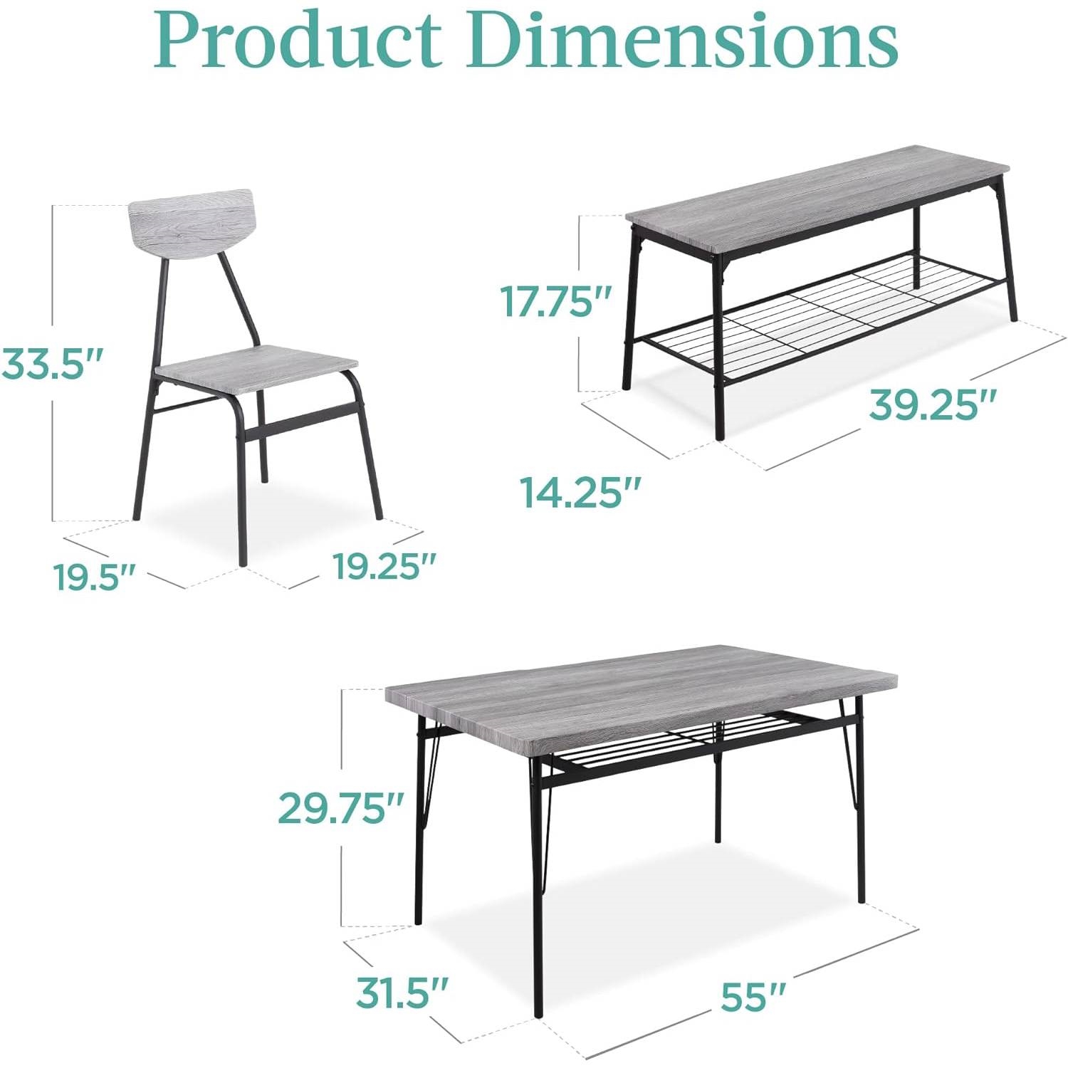 This Modern 6-Piece Dining Set with Grey Wood Top Table 4 Chairs and Storage Bench includes a table, 4 chairs, and a 2-person bench, perfect for family meals or gatherings in your kitchen or dining area. Metal racks under the tabletop and the bench can conveniently hold books, board games, seat cushions, blankets, table mats, coasters, and much more. The rectangular, vinyl wrapped MDF table top is cut extra thick to make it perfect for eating dinner, working on your laptop, or playing games with friends and family. Smooth table & chair finishes let you easily wipe them clean to take care of messes, so your dining set can maintain a new look through years of use. Crafted with a durable, powder-coated steel frame, this set is built to remain sturdy for long-lasting use.